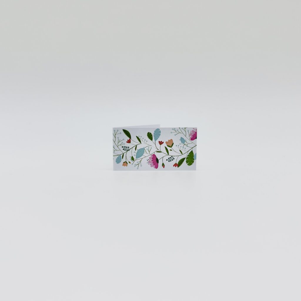 Bigliettini per confetti da stampare su carta bianca o avorio con fantasia a fiori verdi. Stampa digitale personalizzabile con nomi degli sposi e data del matrimonio.